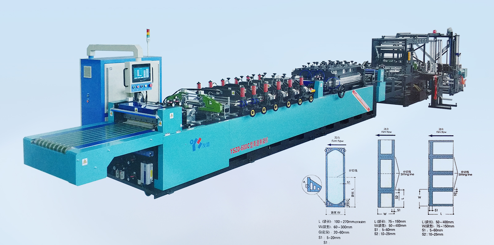 材料:各种复合薄膜。 卷筒:宽度≤1200mm,直径≤800mm。 辅料:宽度≤180mm,直径≤800mm。 制袋速度:180段/分(机械设计速度)约<36m/min左右。 制袋宽度:≤600mm。 制袋长度:50-320mm(超长时可采用倍送装置),程序设置320mm 以上自动转换成倍送。
