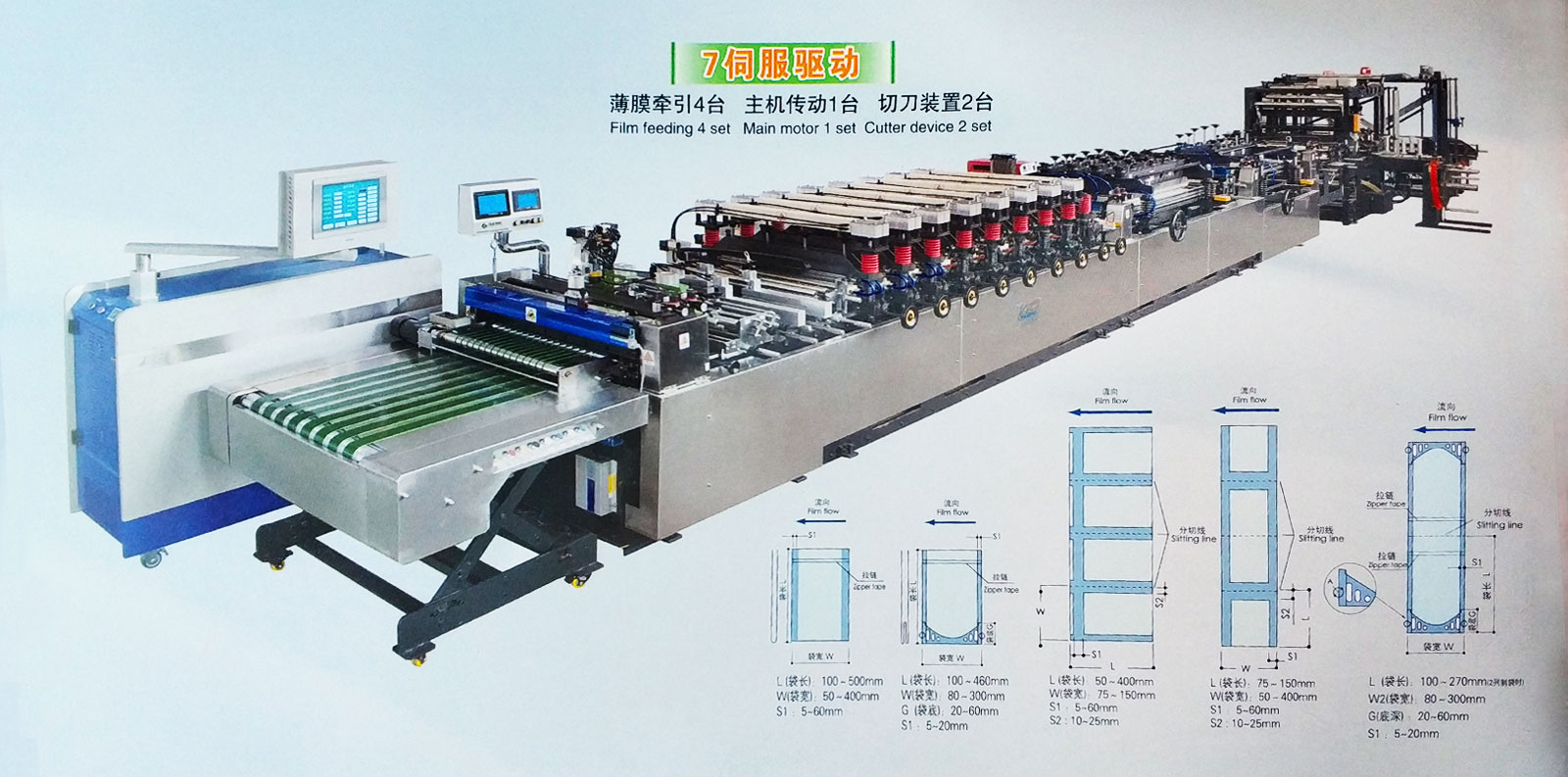 制袋宽度:≤600mm。 制袋长度:50-320mm(超长时可采用倍送装置),程序设置320mm 以上自动转换成倍送。 注:由于袋型、材料等原因实际运行速度会有所下降。